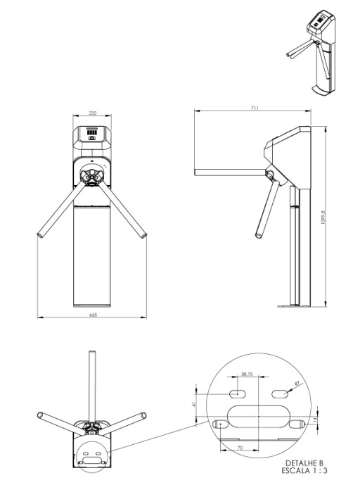 - Braços antipânico (Opcional): Braços articulados que caem na posição vertical para passagem dos usuários quando não há energia vinda da rede elétrica