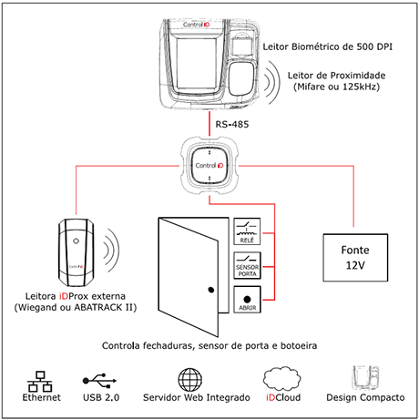 - Identificação biométrica 1:N de até 100.000 digitais (conforme modelo)